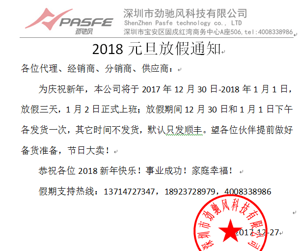 劲驰风科技2018元旦放假通知