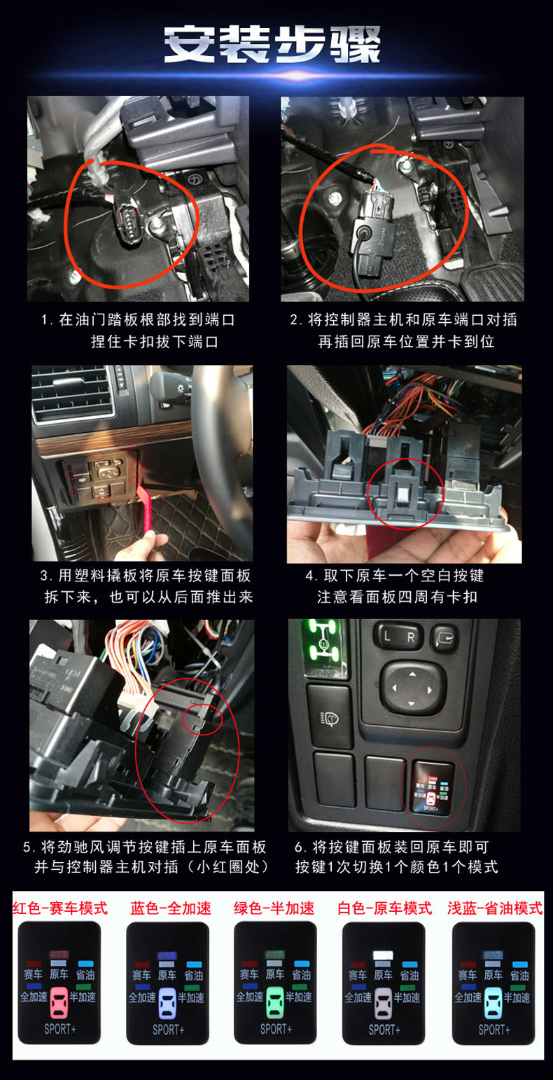 答:POWER BOOSTER 电子油门加速器是专车专用,即插即用型产品;1.在安装上不需要破坏和改动原车任何结构,安装简单快捷又安全(其它改装品需要改电路、线路、油路、电脑、进气、排气等);2.使用更方便,随时可以选择关闭或者打开(其它的一般打开就不能关,关了就不能打开);3.即插即用,马上见效果,无须匹配和磨合期(其它的很多改装后需要磨合);4.多功能(一般动力改装产品只有一个功能,没有更多选项