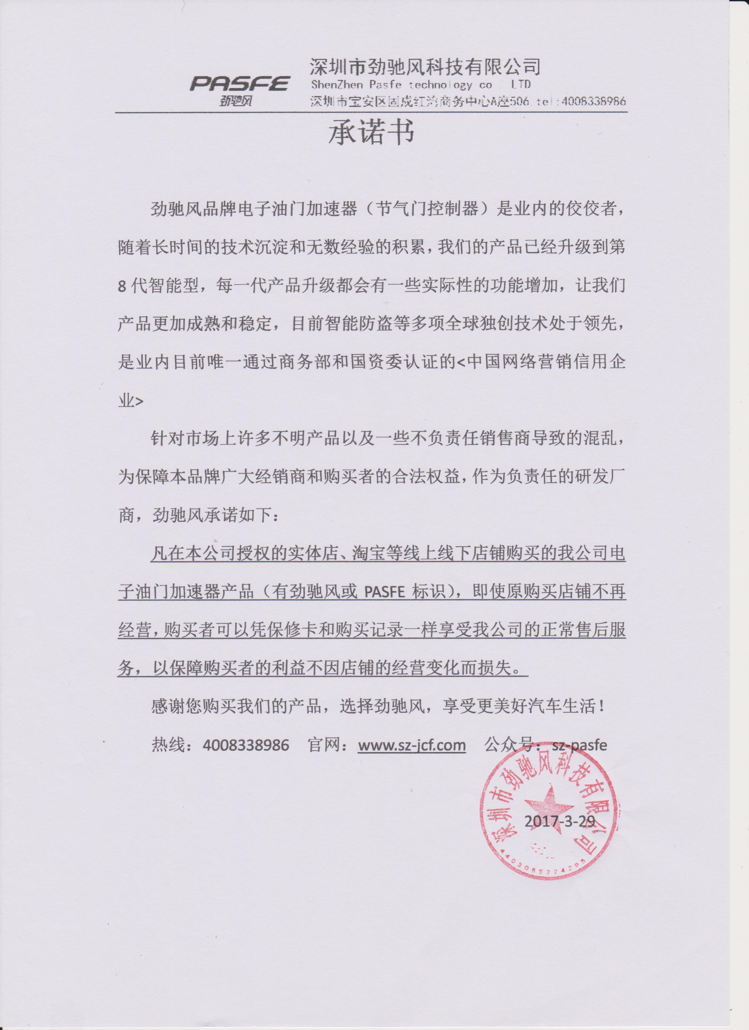劲驰风品牌电子油门加速器售后承诺书!购买无忧