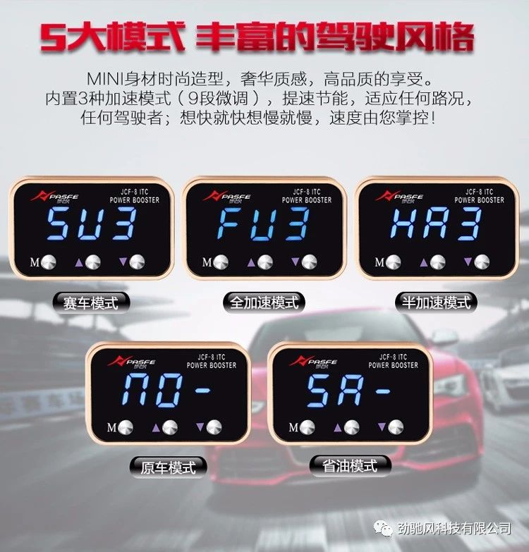 本产品有五大模式:赛车模式、全加速模式、半加速模式、原车模式、省油模式;本产品加速感从强到弱分段非常细微,人性化设计,可以满足不同车友对加速的个性化需求,还可以根据不同的路况来选择不同的模式,不管你是老司机还是新司机总有一种模式适合你。