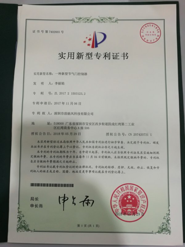 就在 2018年5月29日,劲驰风顺利通过并拿到了实用新型专利证书:一种新型节气门控制器。