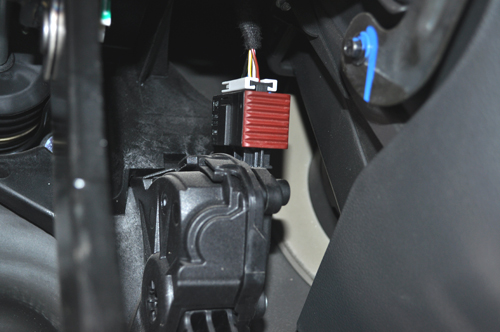 从油门踏板根部找到安装位置,红色就是端口,轻轻一拉红色面板就可以取下来了