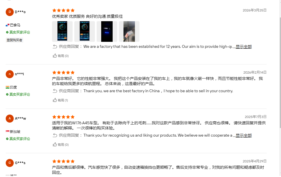 不同的国家有不同的文化,所以对待事务的理解可能不同,但是,完全不影响客户对我们产品的喜爱,图片左侧是客户的名字和国家信息,很高兴我们的产品获得了这么多国家客户的5星好评.