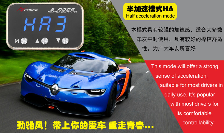 答:看个人爱好,全加速模式有明显的推背感和胎响,对喜欢速度感的车友来说比较适合;半加速模式则没有明显的推背感,但仍然可以消除油门迟滞,适当改善原车提速效果。全加速提速迅猛,会带来强烈的推背感,适合飚车;半加速提速效果为全加速的一半,使油门操控灵敏,适合于日常驾驶